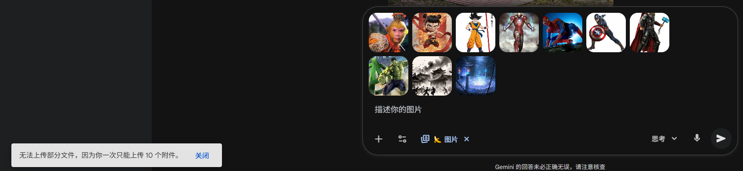 上传:孙悟空、哪吒、七龙珠悟空、钢铁侠、蜘蛛侠、美国队长、雷神、绿巨人(8个角色参考图)+ 2张史诗战场背景 (Gemini APP,最多上传10张)