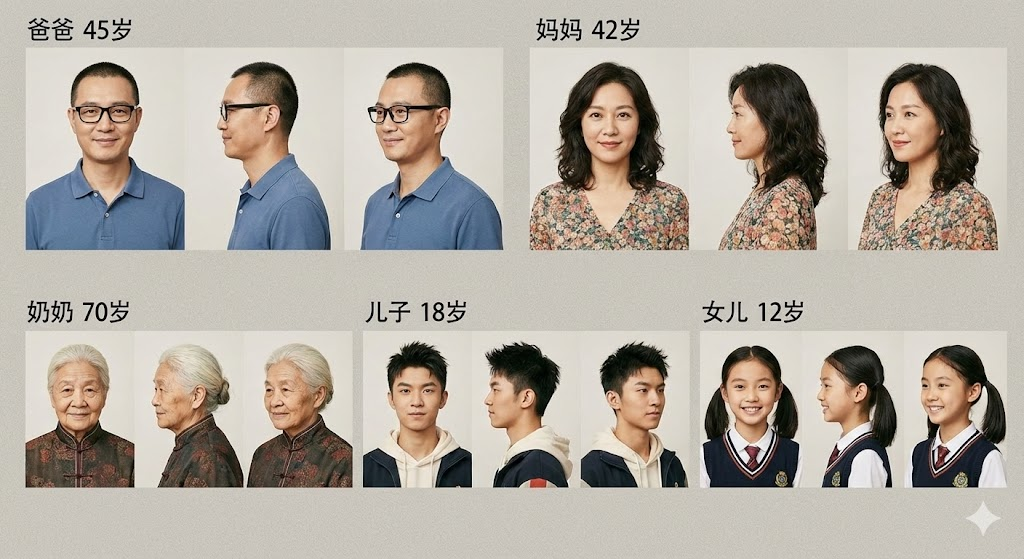 所有面部特征清晰定义用于一致性参考,每人多角度展示,照片级写实风格