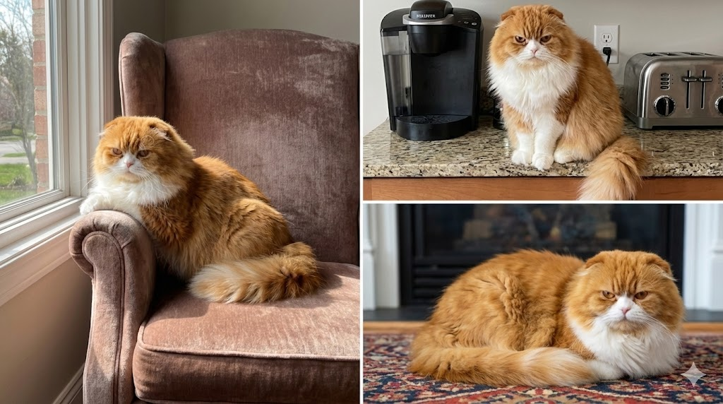 角色变换:这只橘猫在所有场景中保持相同的面部特征和毛色花纹,照片级写实渲染,一致的角色设计