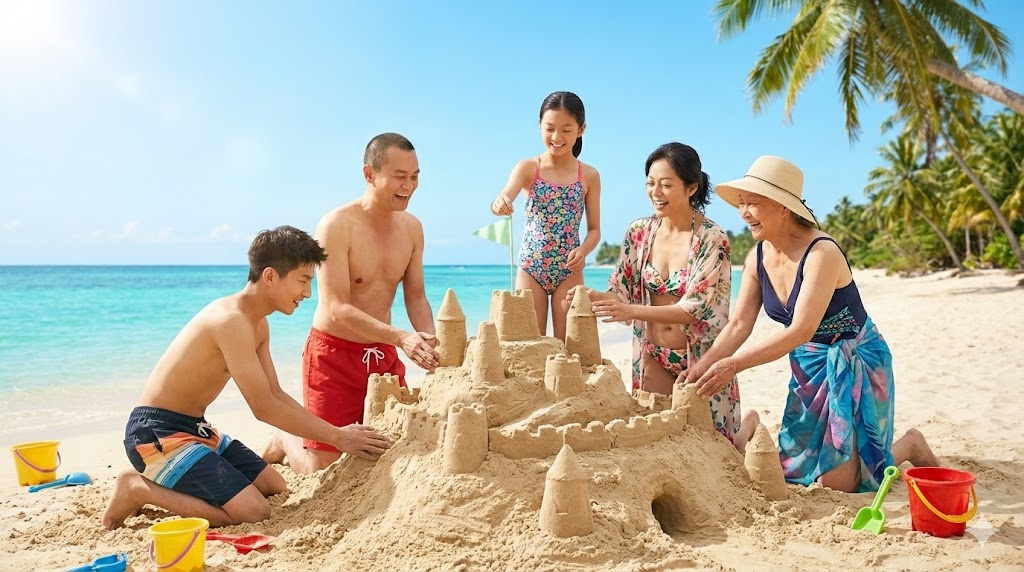 同样的5位家庭成员在热带海滩,穿夏装和泳衣,一起堆沙堡,蓝色大海和棕榈树背景,阳光度假氛围,横版16:9桌面壁纸比例