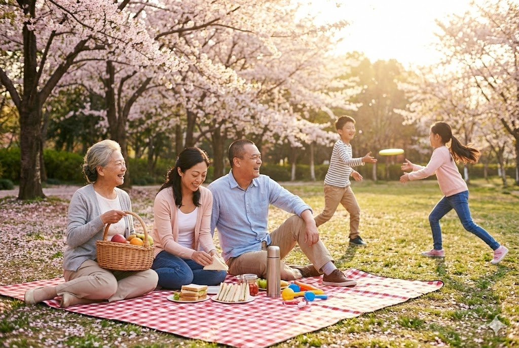 同样的5位家庭成员在公园野餐,坐在格子野餐垫上,奶奶拿着水果篮,孩子们玩飞盘,樱花树背景,春天下午黄金时段光线,横版3:2相册比例