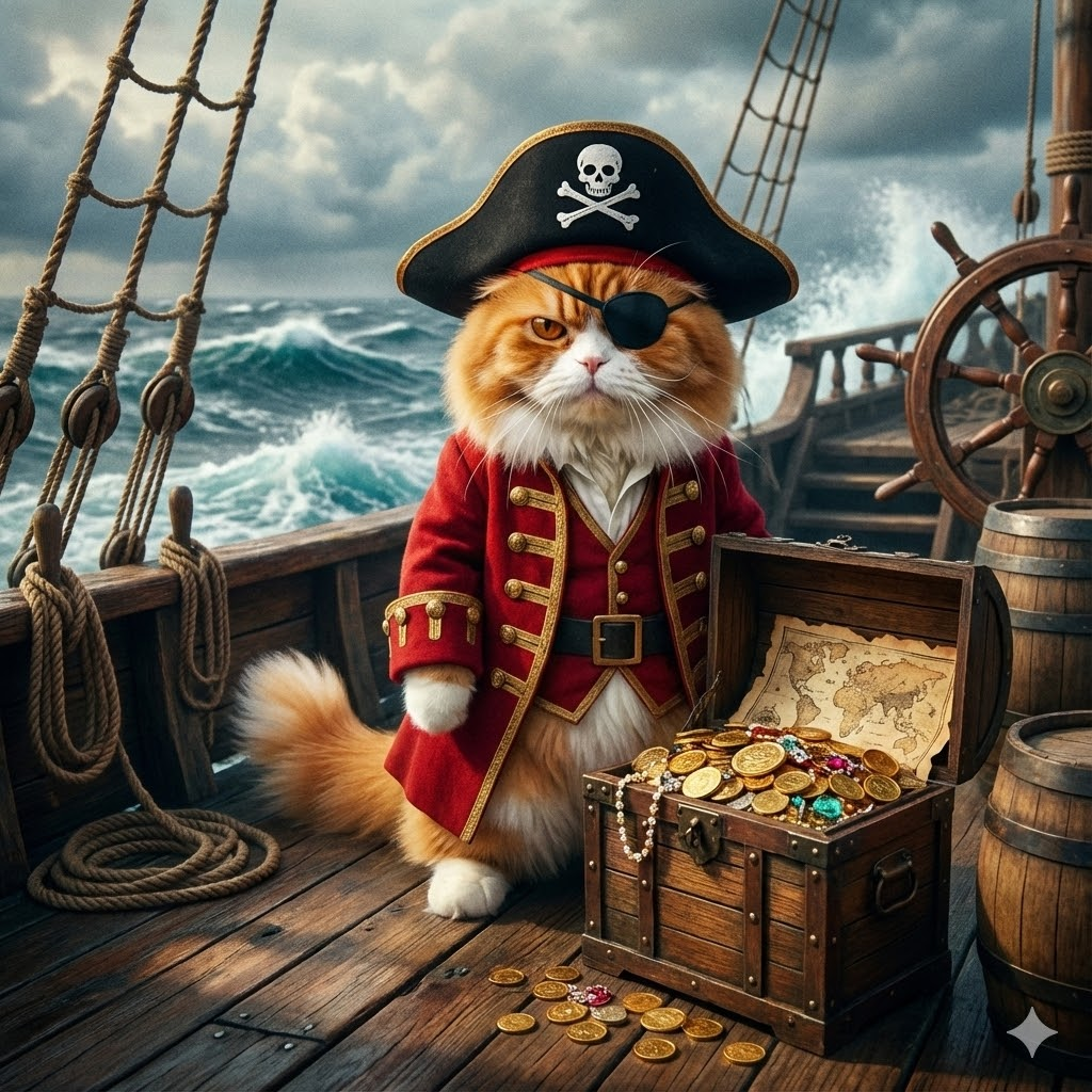 这只橘猫变身海盗船长,方形1:1社交媒体比例,戴黑色三角帽,穿金色纽扣红色外套,一只眼戴眼罩,站在木船甲板上,旁边有宝箱,海浪背景,电影级海盗风格,冒险氛围