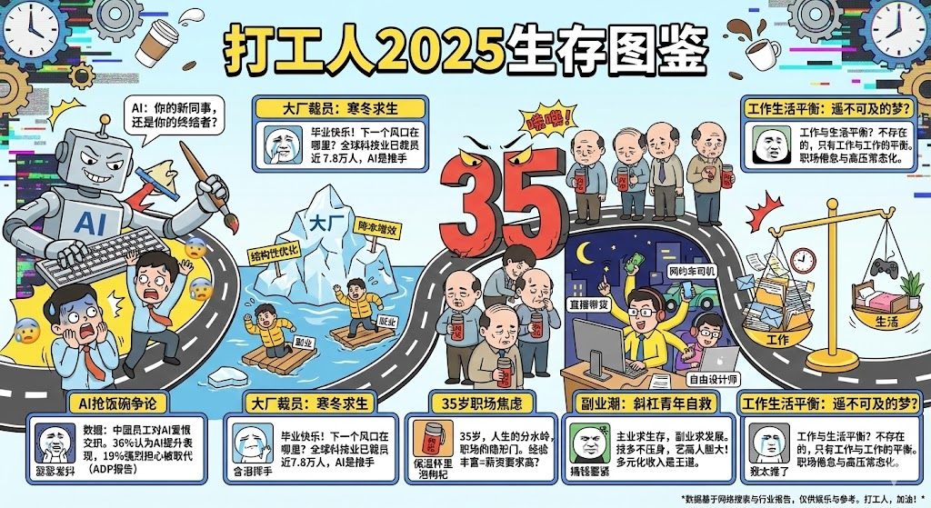 搜索2025年中国职场趋势和科技公司裁员情况,生成一张幽默风格的时间线信息图,标题"打工人2025生存图鉴",包含:AI抢饭碗争论、大厂裁员、副业潮、35岁职场焦虑、工作生活平衡讨论,表情包风格插图混合真实数据,打工人共鸣风格
