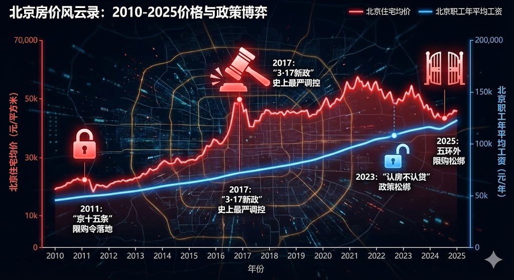搜索北京住宅房价2010到2025年均价数据,生成折线图展示价格趋势,标注关键政策节点(限购、调控),加入平均工资对比线,戏剧化可视化风格,红蓝配色,中文标注人民币单位