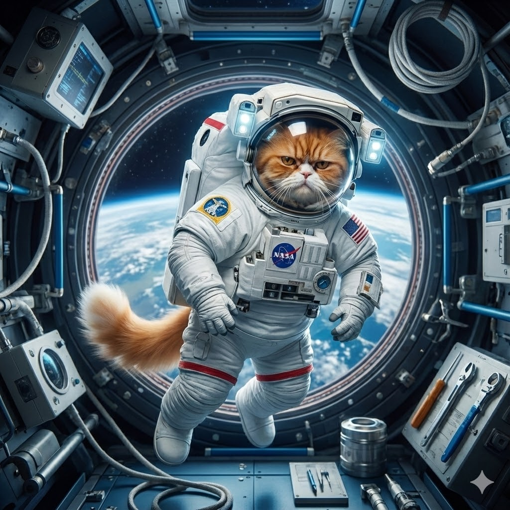 这只橘猫变身宇航员,方形1:1社交媒体比例,穿白色NASA太空服,头盔面罩打开露出脸,漂浮在国际空间站内部,窗外可见地球,零重力姿态,科幻电影品质