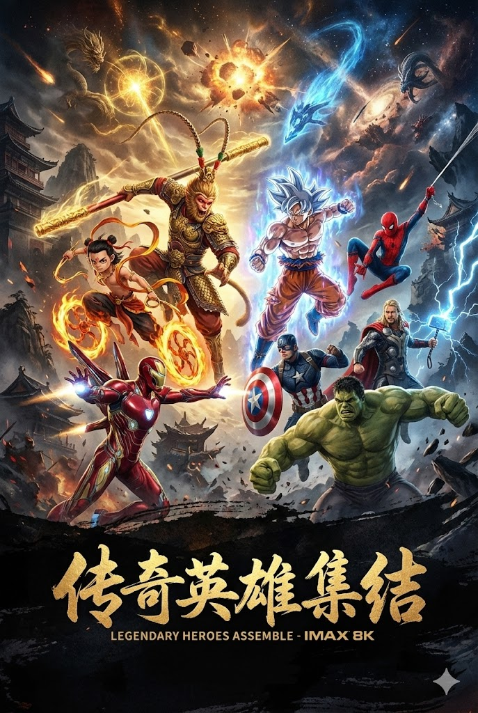 史诗级多元宇宙英雄大战海报,竖版2:3电影海报比例,孙悟空(美猴王)挥舞金箍棒,哪吒踩风火轮持乾坤圈,龙珠悟空银色自在极意功形态,与漫威英雄并肩——钢铁侠Mark 85战甲、蜘蛛侠吐丝、美国队长持盾、雷神召唤闪电、绿巨人重拳出击,全员集结对抗宇宙级反派威胁,电影大片海报构图,戏剧化轮廓光,中国神话美学融合漫威宇宙,爆炸和能量特效,IMAX 8K品质,底部留白放"传奇英雄集结"标语