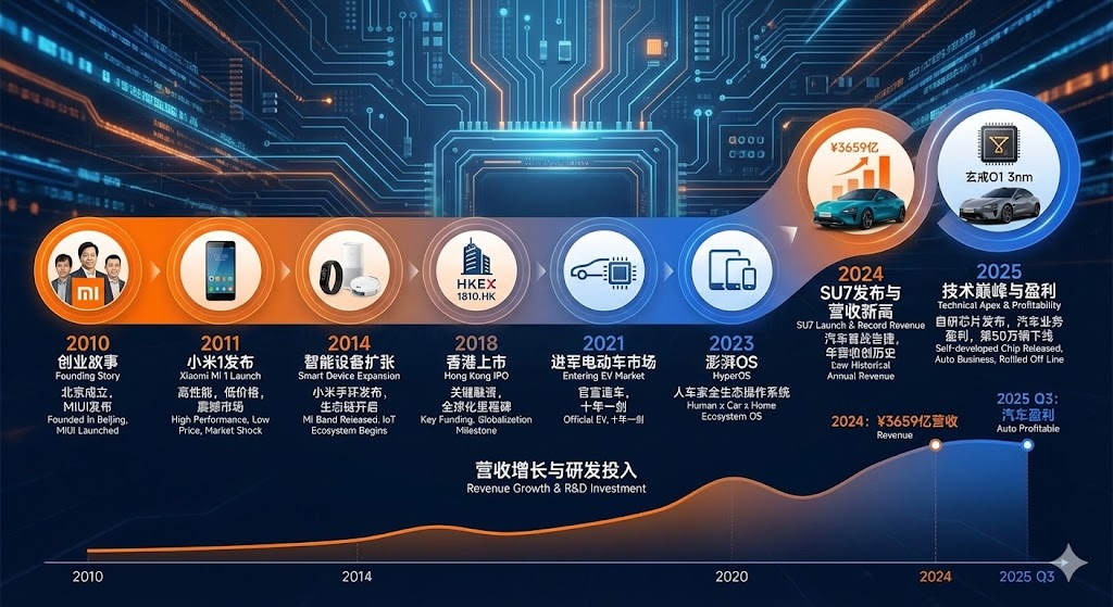搜索小米公司2010到2025年的发展历程和重要里程碑,生成一张视觉时间线信息图,包含:创业故事、小米1发布、智能设备扩张(小米手环)、进军电动车市场、关键融资轮次、营收增长,现代科技创业风格,橙蓝品牌色,中文标注。